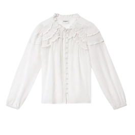 Blusen har rund hals med fine rynkede afslutninger, knaplukning foran og dekorative rynkedetaljer ved front og skuldre, som skaber blød volumen. De lange ærmer afsluttes med smalle manchetter med knapper, og den afrundede kant giver et let og feminint fald.