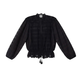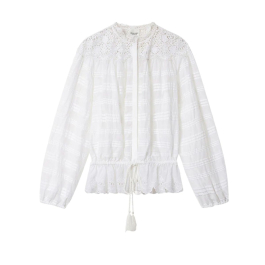 Blusen har rund hals, lange ærmer med elastiske manchetter og et let figurskabende snit med justerbar talje og dekorativ snøre med kvaster. De diskrete læg og broderie anglaise-detaljer tilfører tekstur og karakter, mens den let udstillede pasform giver et elegant fald.