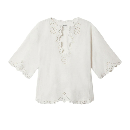 Den tunesiske halsudskæring er dekoreret med broderie anglaise, mens de korte, let trompetformede ærmer og den bølgede, åbne kant forneden tilfører et luftigt og eksklusivt look. En feminin top, der balancerer afslappet elegance med fine detaljer.