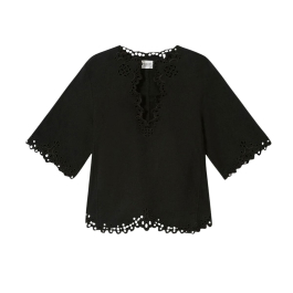 Isabel Marant Shana Top i farven Faded Black er en elegant og feminin tunika-inspireret top, udført i blød bomuld med smukke openwork-detaljer. Det let transparente broderi giver et raffineret, bohemepræget udtryk, som er karakteristisk for Isabel Marants signaturstil.