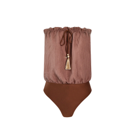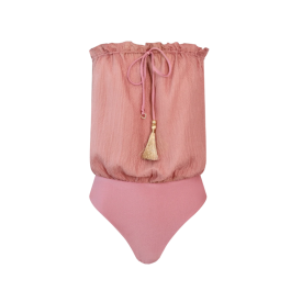 Denne unikke pinke nuance badedragt skiller sig ud med sin smukke farve og feminine design. Overdelen er let og luftig, hvilket gør den perfekt til både sommerfester og afslappede dage. Guldfrynsedetaljen giver et eksklusivt touch, og den bløde pasform sikrer komfort hele dagen. Kan styles med en nederdel eller bruges som et statement-piece alene.